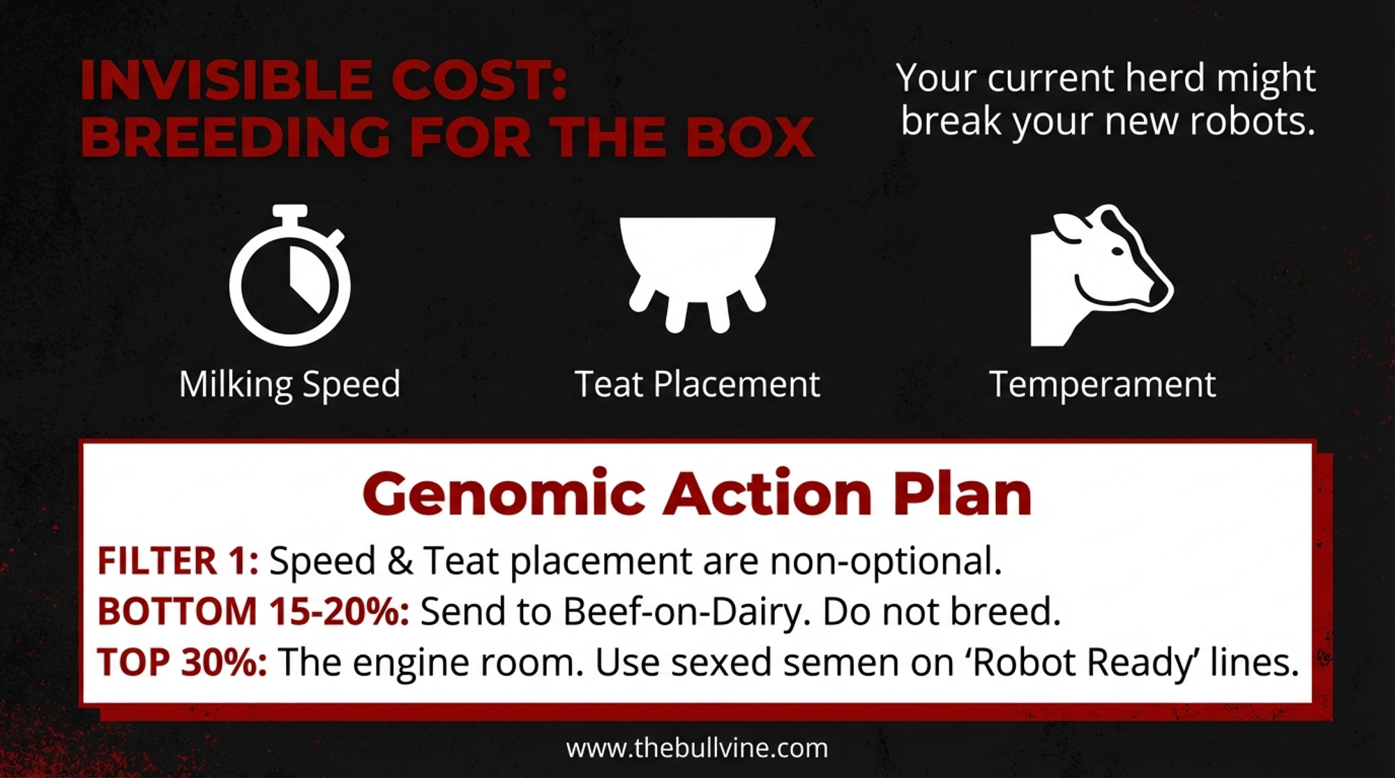 - Genetics has to match your system. Milking speed, udder design, health, and hoof traits become expensive blind spots in a robot barn if you ignore them.