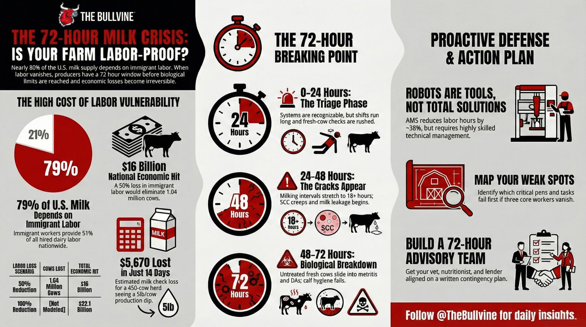 Executive Summary: Seventy-nine percent of U.S. milk comes from farms that depend on immigrant labor. When that labor vanishes, you don’t have weeks to pivot—you have 72 hours before milking intervals stretch, SCC climbs, and fresh cows slide into DAs and metritis while you’re too short-staffed to catch them. A Texas A&M modeling study found that losing half of immigrant dairy workers would eliminate 1.04 million cows and 24.2 billion pounds of milk, causing $16 billion in economic damage. One Idaho dairy saw a third of its crew disappear in three weeks—not from a raid on their farm, but from fear after enforcement hit a plant 50 miles away. For a 450-cow herd at $18/cwt Class III, losing 5 lb/cow/day for two weeks means $5,670 off the milk check before you count the fresh cows that went south. This article delivers a working 72-hour contingency plan: map your weak spots, quantify your labor exposure, stress-test your AMS assumptions, build a crisis reserve, and get your vet, nutritionist, and lender in the same room before you need them.