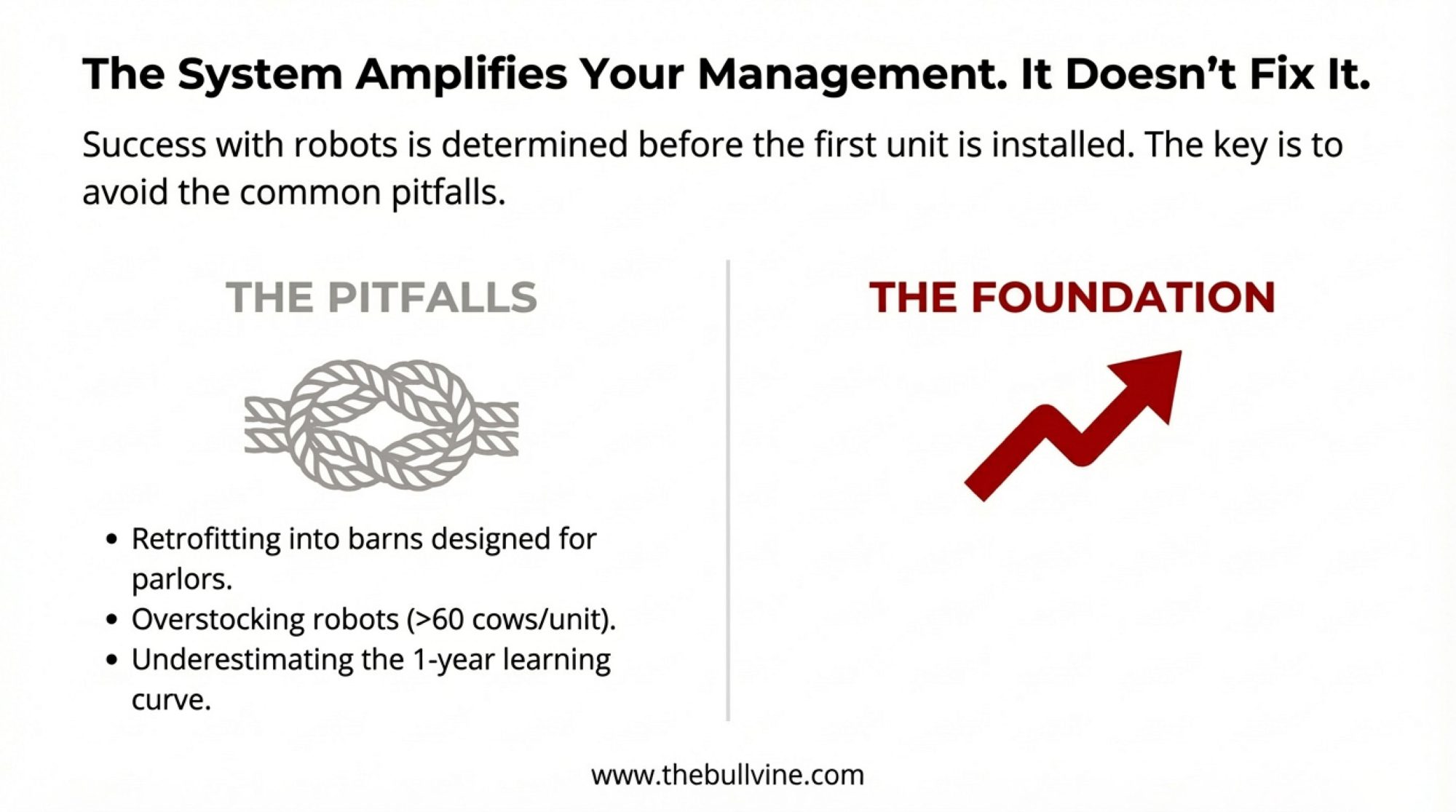 - Nail the fundamentals before install: 55–60 cows per robot maximum, structured heifer training, and excellent hoof health aren’t optional—they separate success from struggle.
