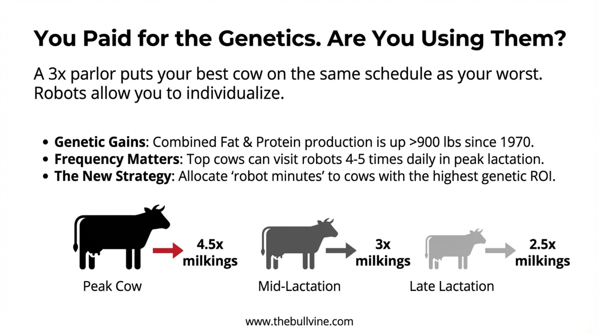 In a conventional 3x parlor, your top and bottom cows are on the same schedule. A high‑genetic‑merit cow that could profitably be milked 4 or 5 times a day stands in line with a late‑lactation cow you’re trying to dry off clean. Both take the same parlor time, even though the return on that time is very different.