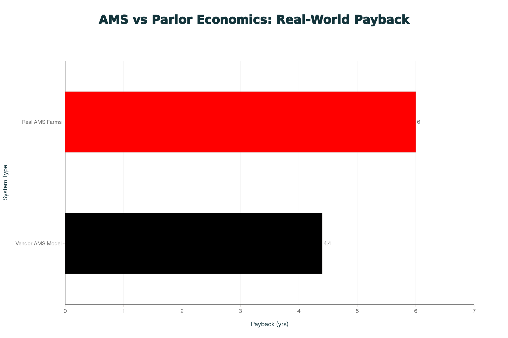 University extension economists in the U.S. and Canada have built a range of AMS vs parlor budgets. According to economic analyses from Minnesota, Wisconsin, and Canadian extension programs, under good design and strong management, payback for robots often falls in the 3.8–5-year range, driven mostly by labor savings and modest production gains.