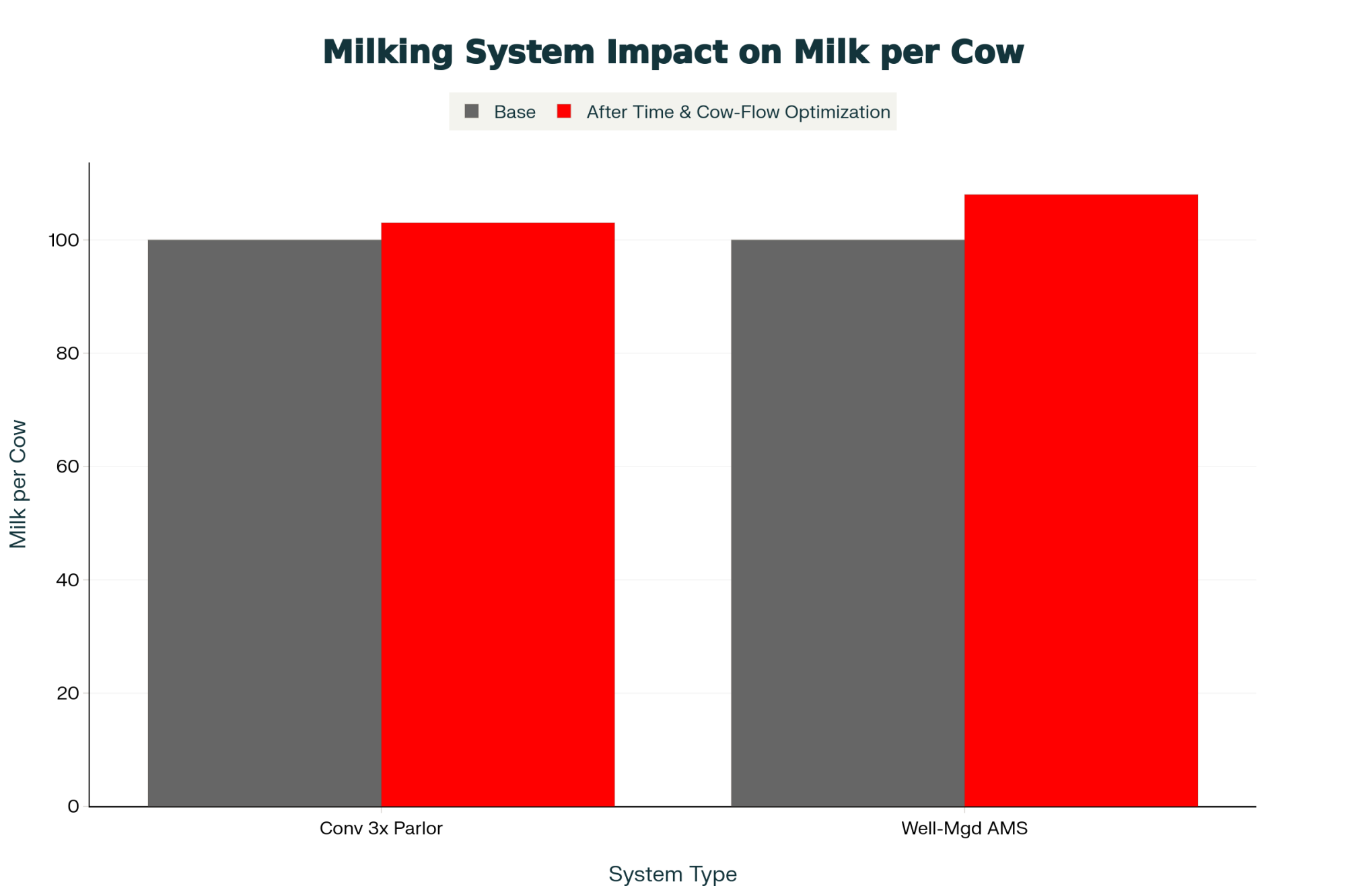 - Robots recover time, and time recovers milk: Well-managed AMS herds report 3–8% higher production per cow by giving back the hours that parlor routines take away.