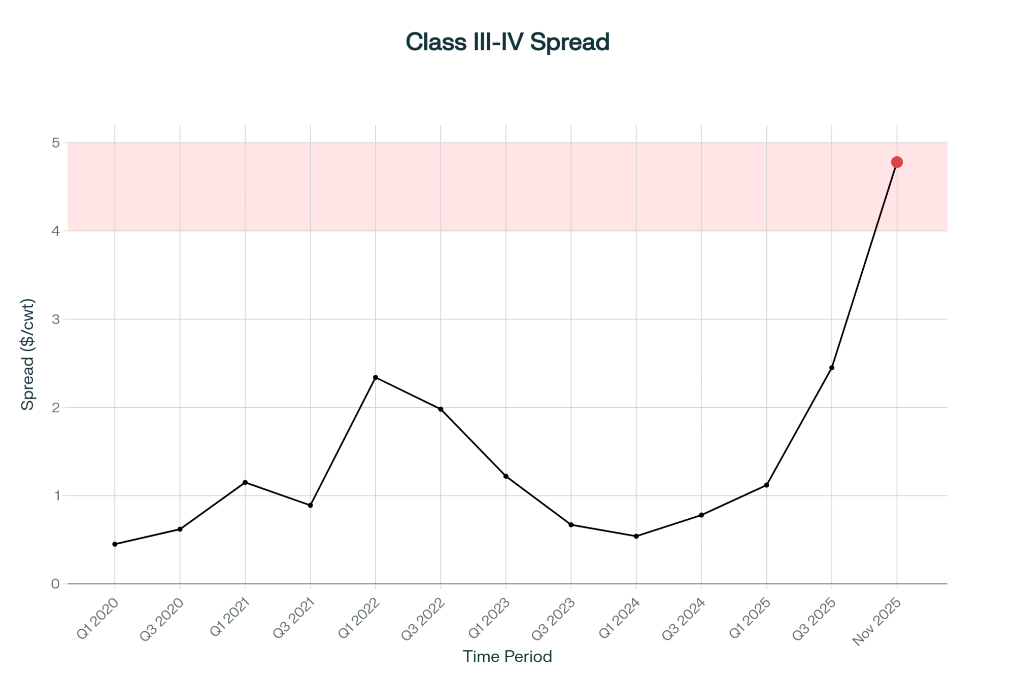 Let me share what’s happening with the Class III-IV spread—it hit $4.78 per hundredweight this week. That’s the widest gap we’ve ever had in Federal Order history, based on the CME futures data from November 13th.
