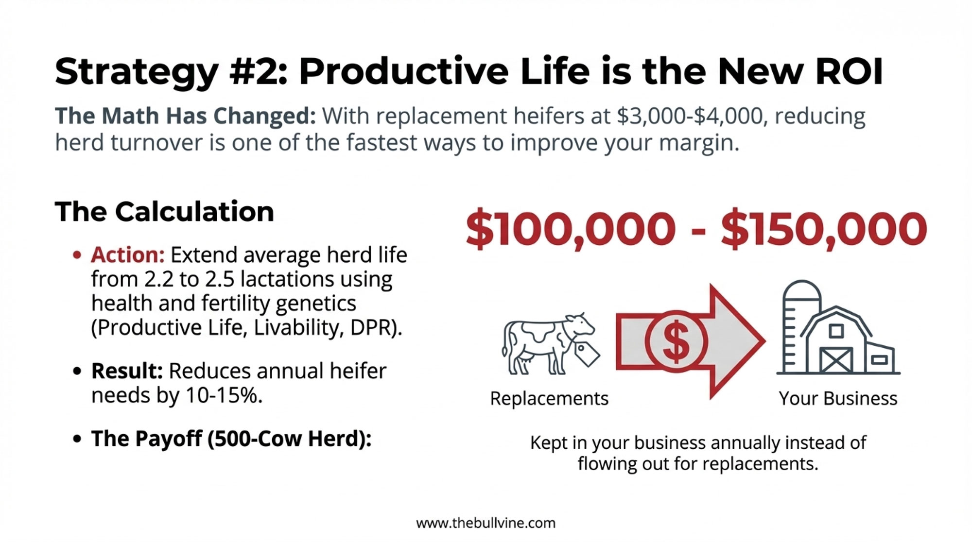 The calculation that keeps coming up: extending herd average from 2.2 to 2.5 lactations through improved fertility and health genetics can reduce heifer purchases by 10-15%. On a 500-cow operation, that potentially keeps $100,000-$150,000 annually in the business rather than flowing out for replacements.