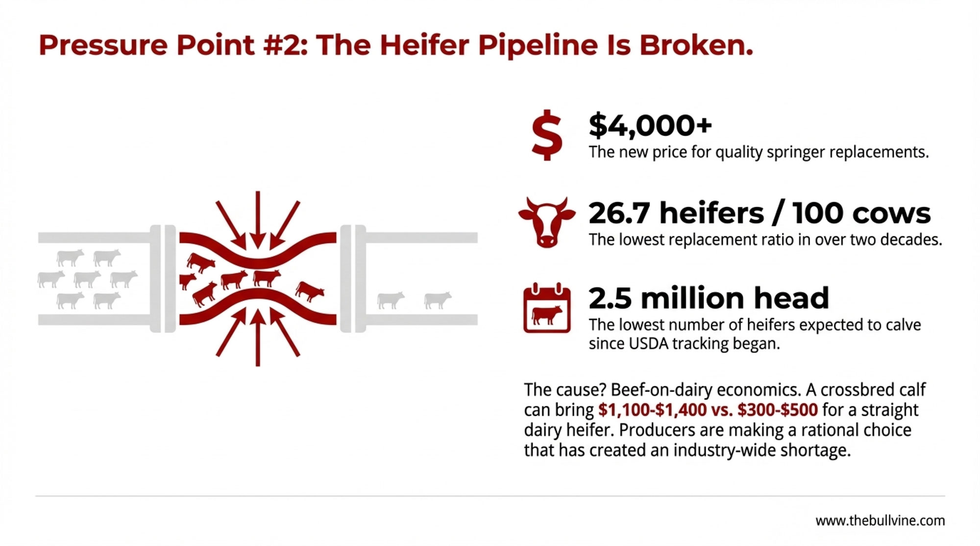So here’s the hard truth many of us are dealing with: a lot of farms leaned into beef‑on‑dairy so aggressively—because that 600–900 dollar beef calf check looked awfully good—that they’re now staring at 2,500‑plus replacement heifer prices when they want to expand or even just maintain herd size. Analysts in Dairy Herd have gone so far as to say that America’s heifer shortage is actively limiting expansion and that the “big money in beef‑on‑dairy” is one of the key drivers.
