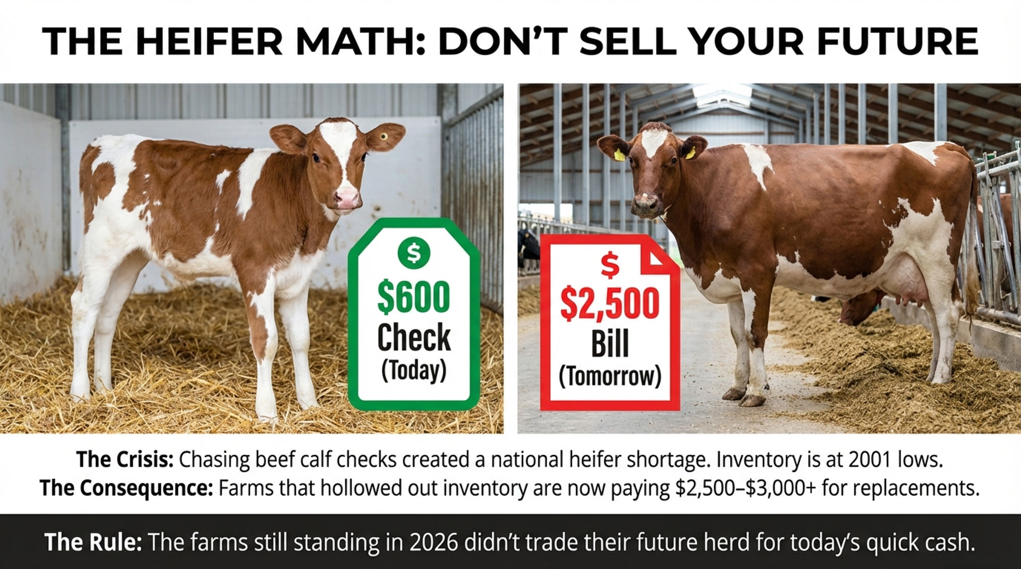 $600 beef calf or $2,500 heifer? The farms still standing in 2026 didn’t trade their future for today’s calf check.