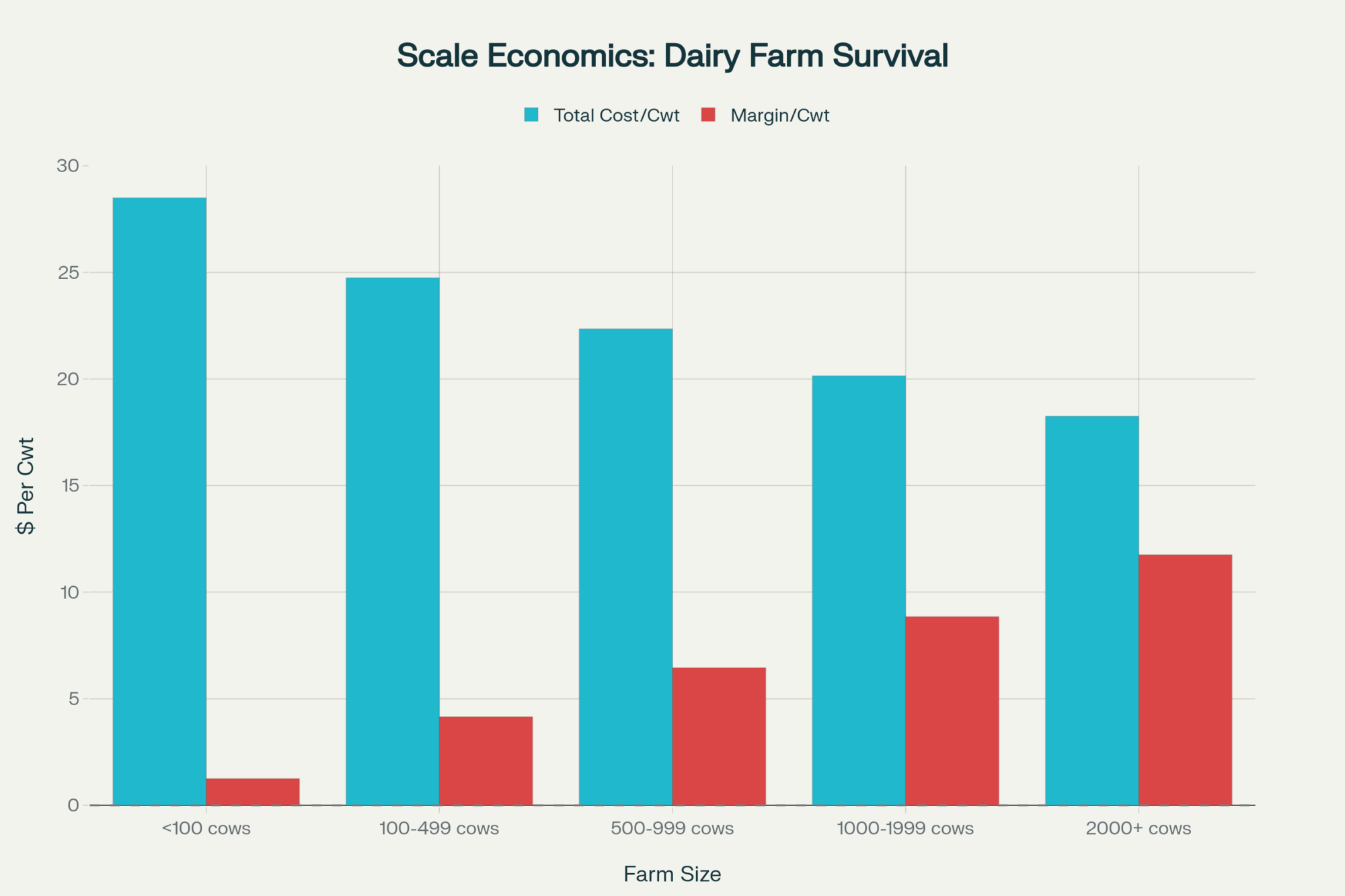 The structural cost disadvantage facing small dairy operations is mathematically insurmountable—no disaster payment can bridge a $23.56/cwt permanent gap when mega-dairies operate at less than half the cost of farms with fewer than 50 cows