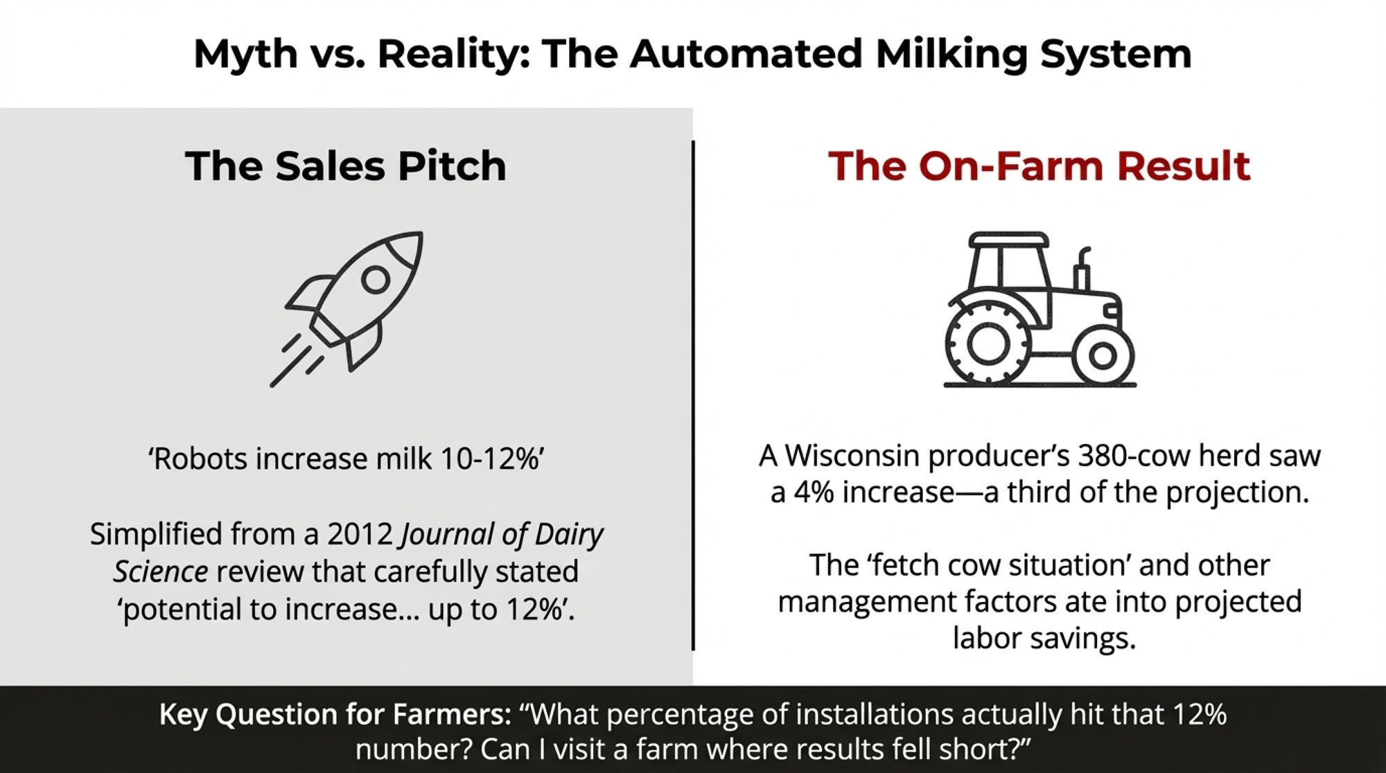 By the time those findings work through extension publications, the hedging softens. By the time it reaches some dealer presentations? The message becomes simply: “Robots increase milk 10-12%.” The asterisks disappear.