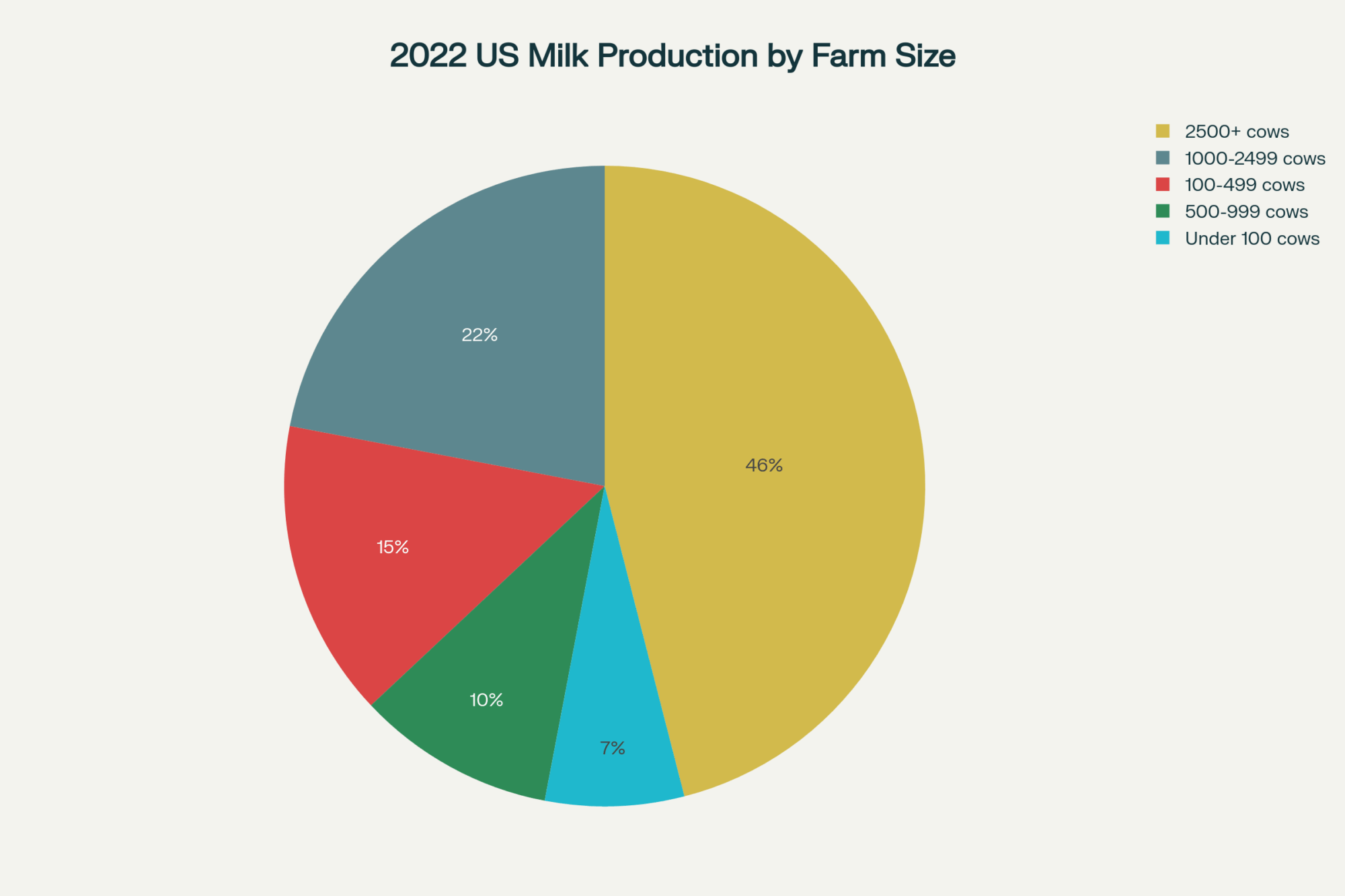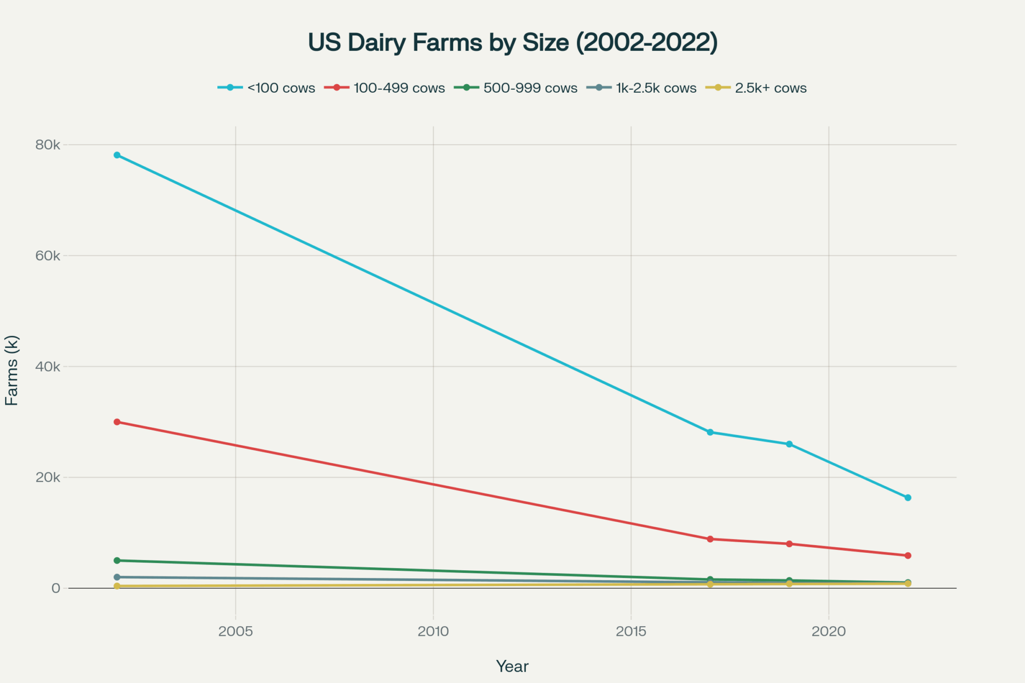 But here’s the kicker everyone’s missing: while all these farms disappeared, milk production actually climbed 5%. How’s that work? Those mega-dairies with 2,500+ cows grew by 16.8% and now control 46% of all U.S. milk production.