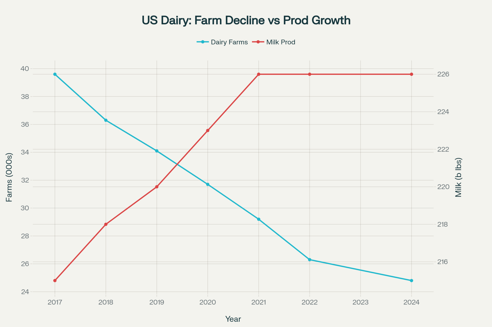 Let me throw some data at you that’ll make you sit up straighter than a fresh heifer at her first milking. Between 2017 and 2022, we lost nearly 40% of our dairy farms—dropping from about 39,600 operations to just 24,000 according to the latest USDA Census. That’s not consolidation, that’s a stampede for the exits.