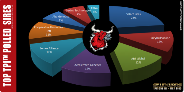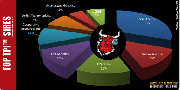 Select Sires increases their stranglehold on the top TPI proven sires by increasing 5% over last year to now posses 31% of the top sires. Dropping slightly is ABS global going from 22% to 16% but moving up to a tie for the #2. Showing a significant decline in the top proven sire rankings is former #2 and now #3 dropping 8% to 16% is CRI. (Read more: STUD WARS – THE BATTLE FOR A.I. SUPREMACY & STUD WARS: EPISODE II – APRIL 2014)